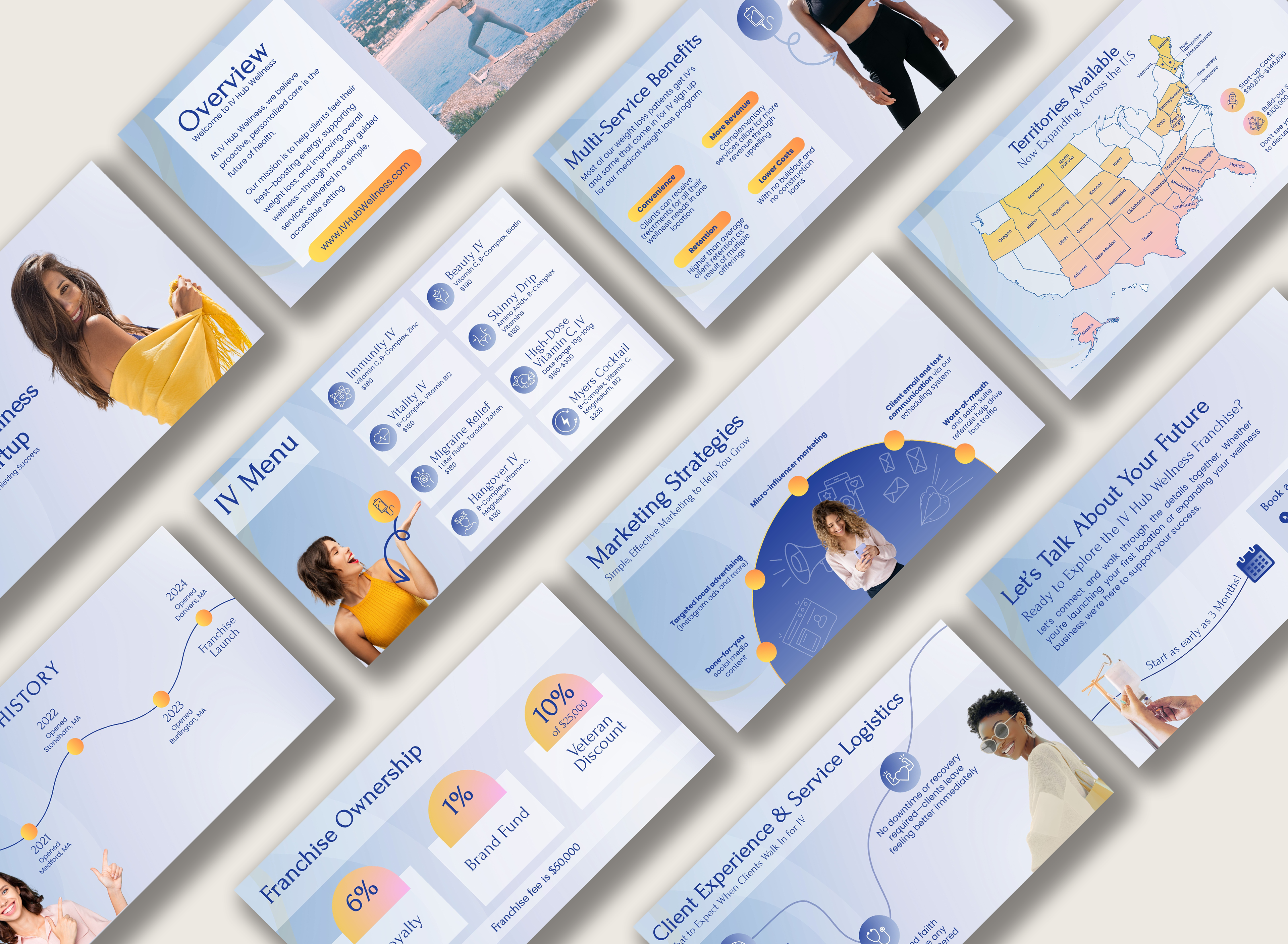 SUMMARY: Developed graphic styling, layout and design of PowerPoint deck for IV Hub Wellness. Client requested use of icons and imagery to convey services and personality of the brand. Design also involved the creation of custom map.