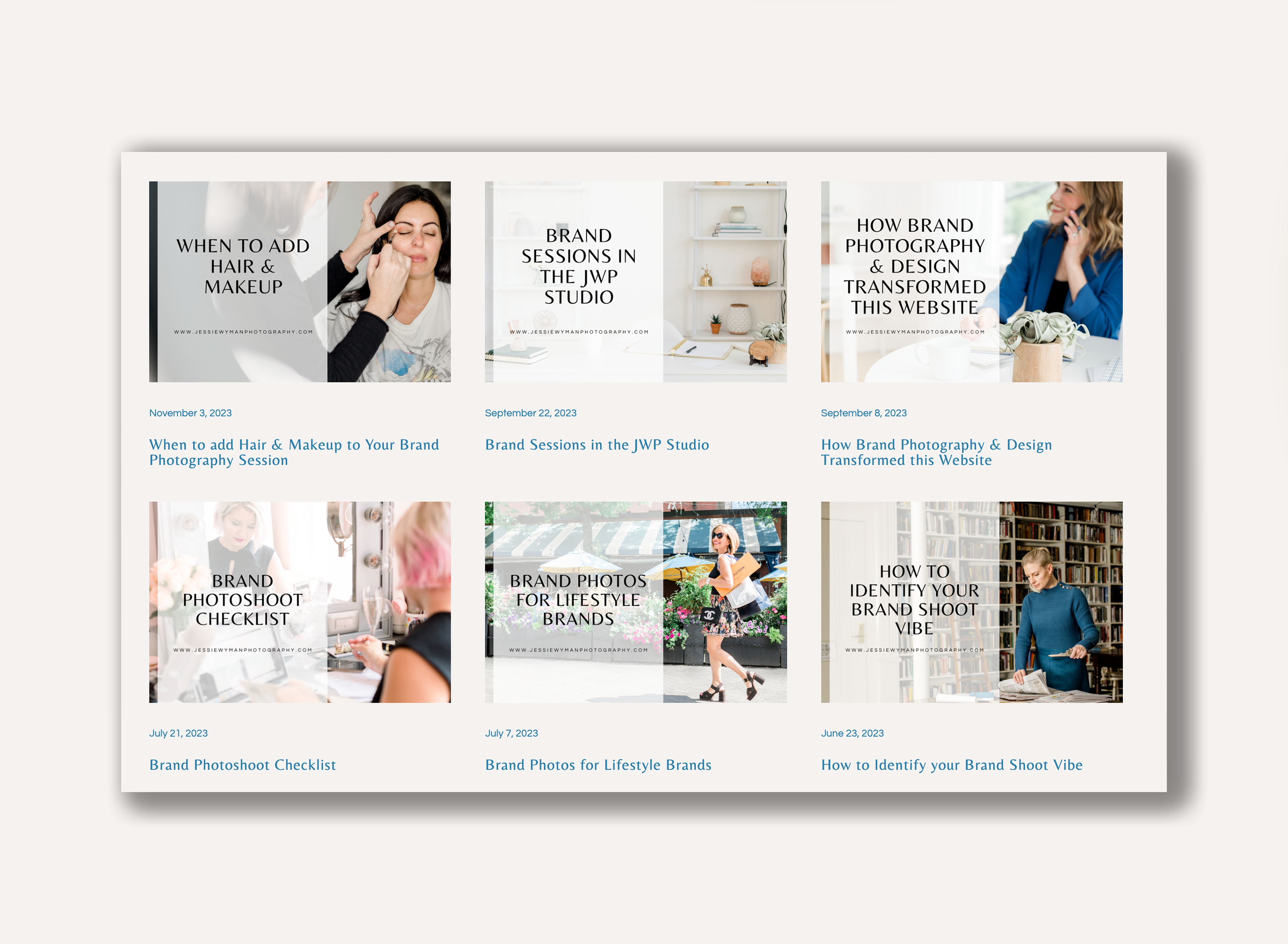 SUMMARY: Sample graphics designed for my own business, Jessie Wyman Photography. Graphics primarily created to direct traffic to long-form blog content and subsequent CTAs for email campaign welcome sequence.